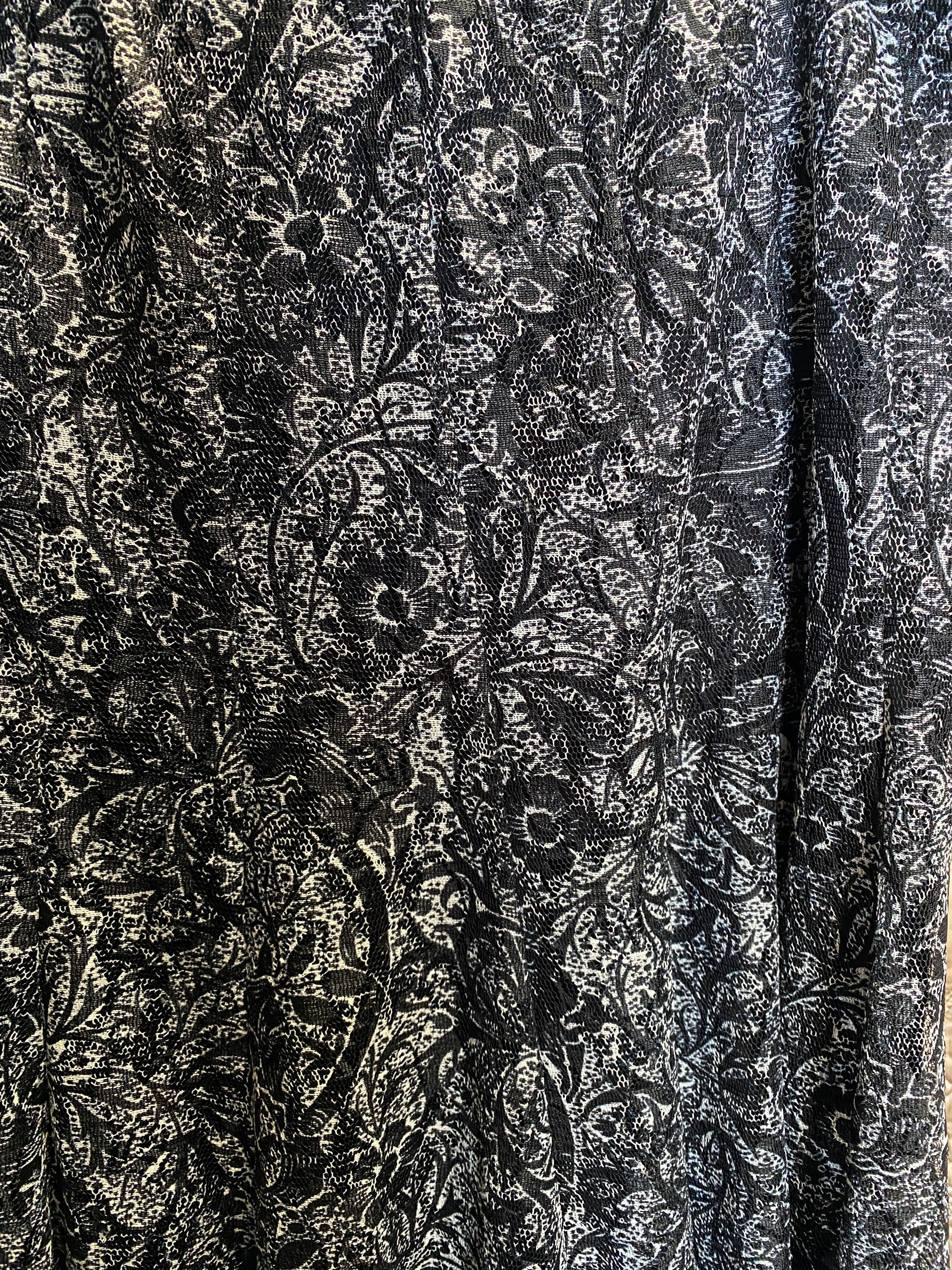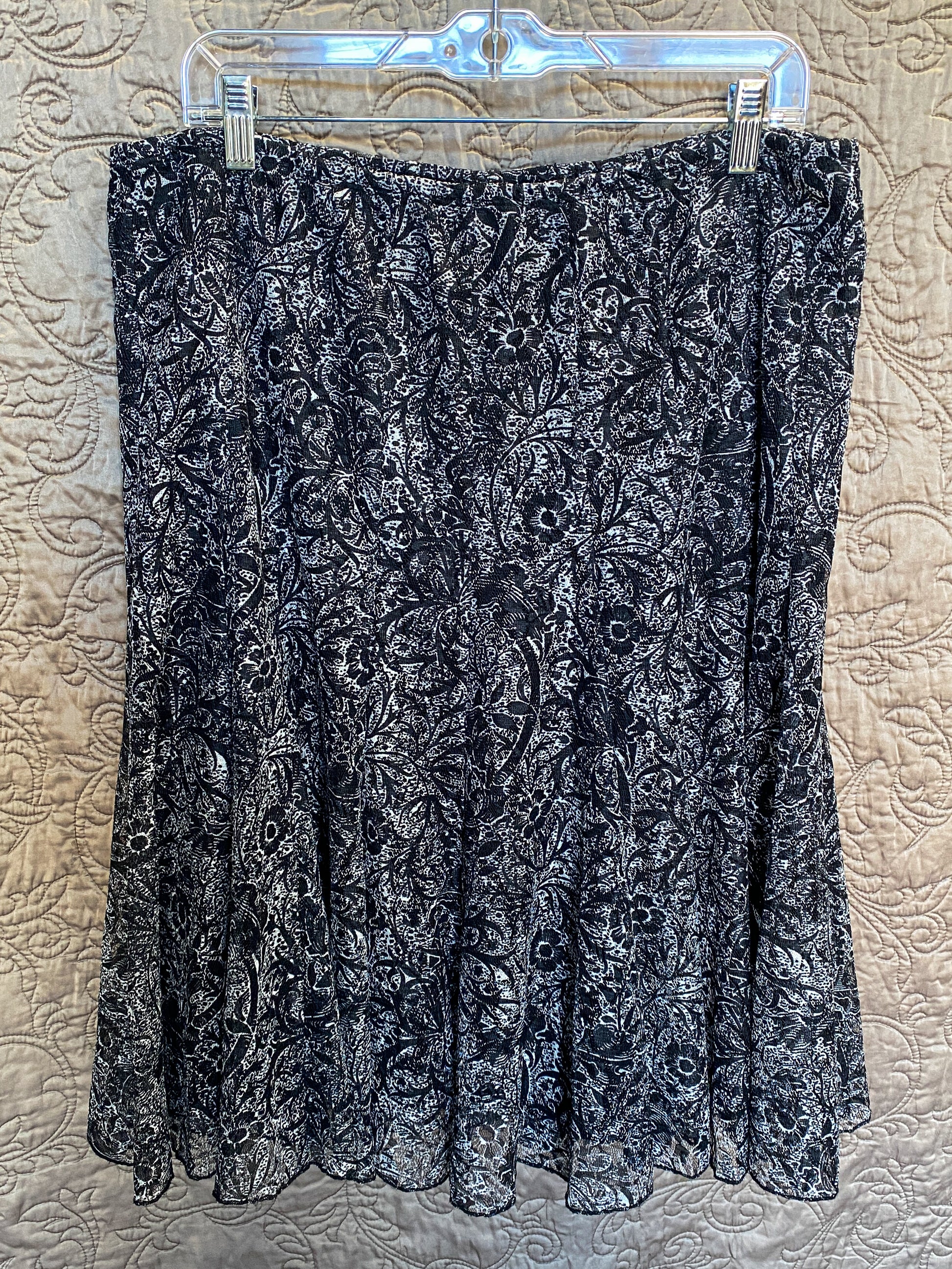 This Coldwater Creek skirt features a delicate black and white botanical print over a lightweight mesh fabric. It has a comfortable elastic waistband and a gentle A-line silhouette that provides plenty of movement through the hem. The skirt is fully lined to ensure coverage while maintaining that airy, breathable feel. Its timeless floral pattern has a slightly etched, artistic look that makes it easy to coordinate with a simple top or a structured jacket.