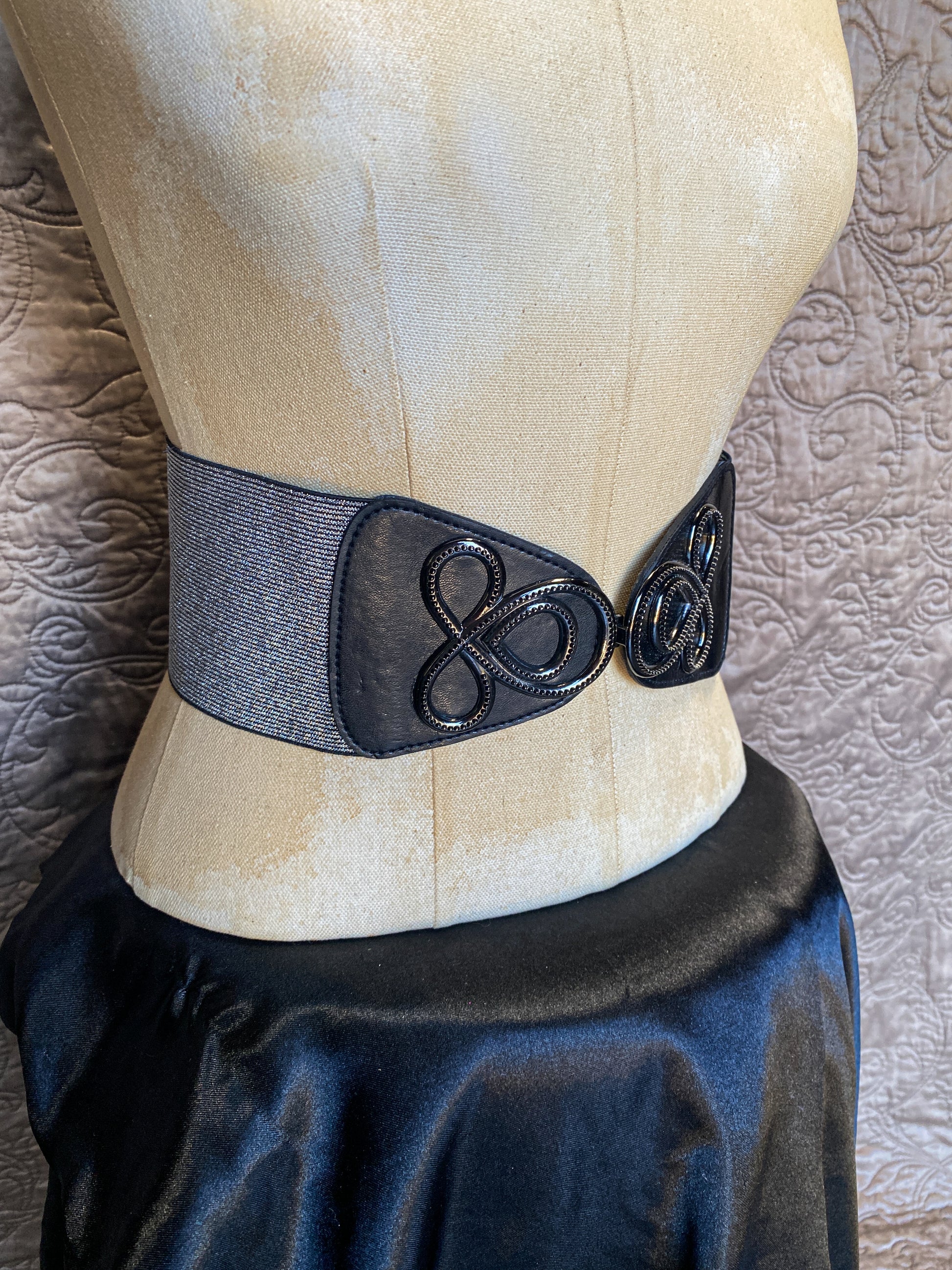 This wide elastic waist belt features a black and silver woven-style band that offers a comfortable stretch fit. The focal point is a beautiful, dark ornate buckle that fastens at the center.