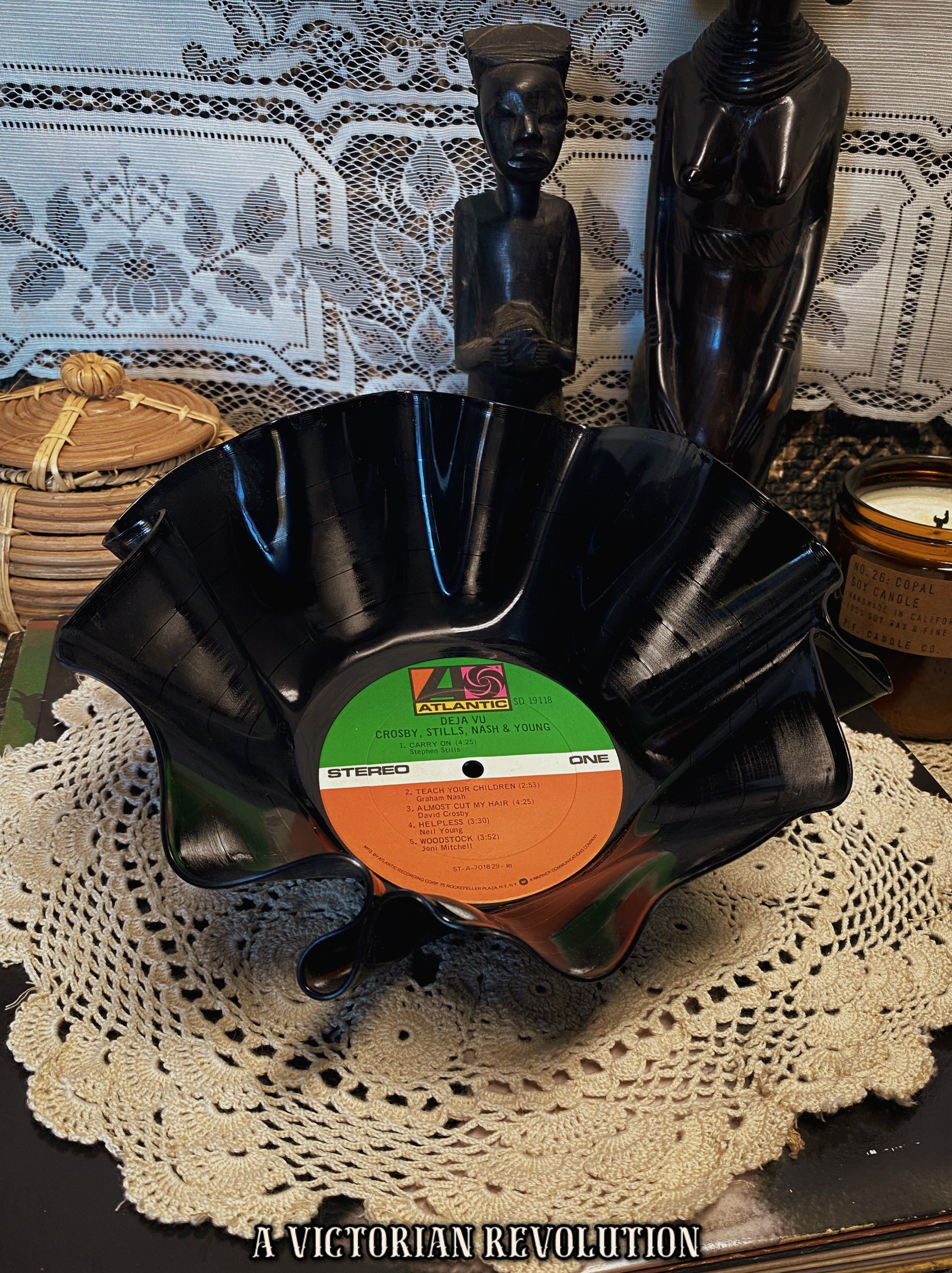 This unique catch-all dish is handcrafted from a salvaged copy of the 1970 masterpiece Deja Vu, breathing new life into a piece of music history through the art of upcycling. The heat-formed scalloped edges transform the original 12-inch vinyl into a functional conversation piece that retains the iconic green and orange Atlantic Records label as its center focal point. It serves as a perfect gift for classic rock enthusiasts or a retro addition to any home office, providing a stylish home for keys, mail, or guitar picks while celebrating the enduring legacy of 1970s folk rock.