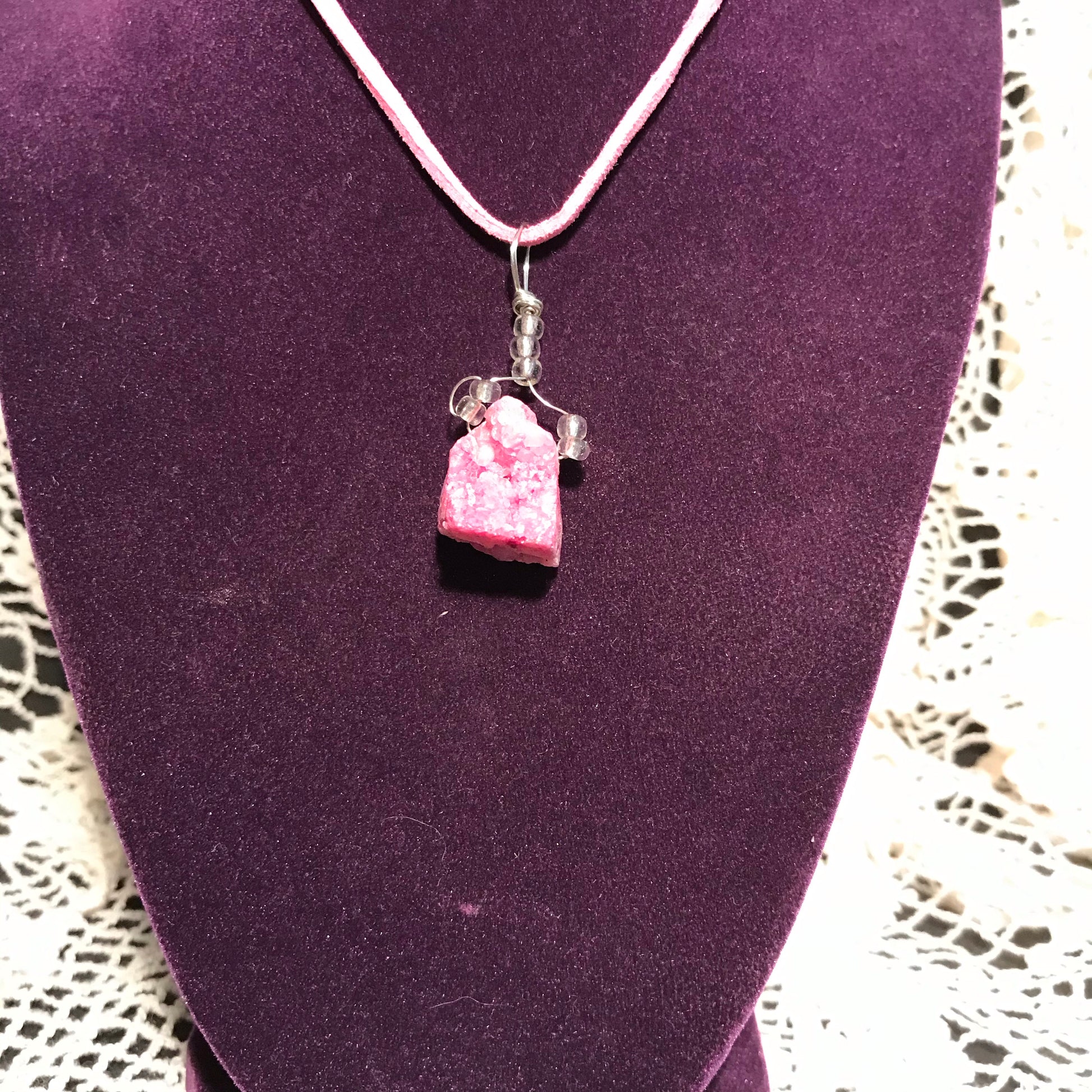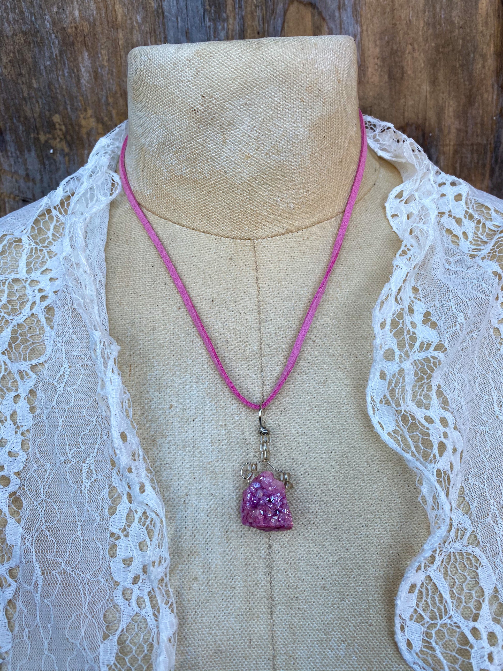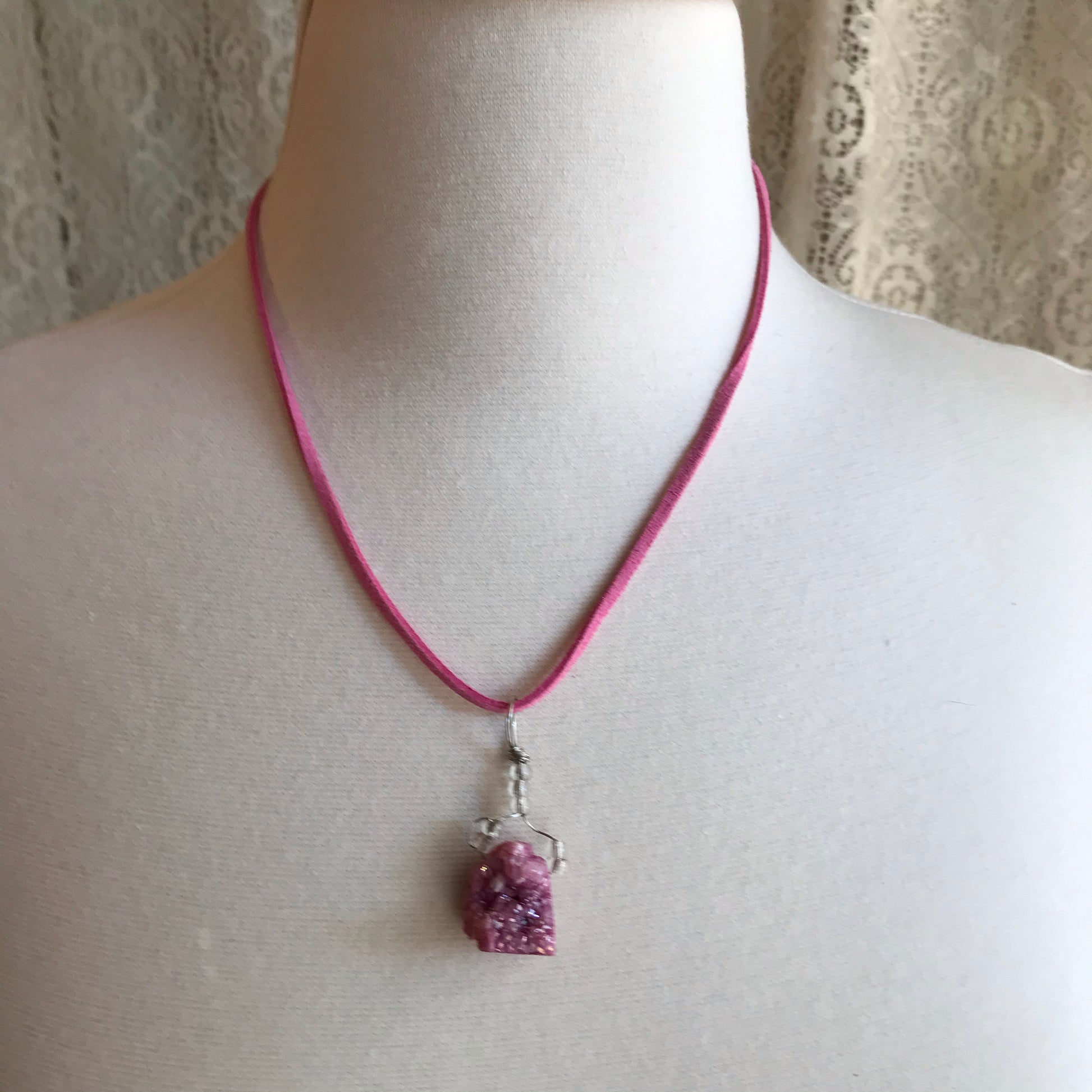This Druzy crystal necklace was assembled by hand in my studio. It comes on an 18 inch vegan suede cord.