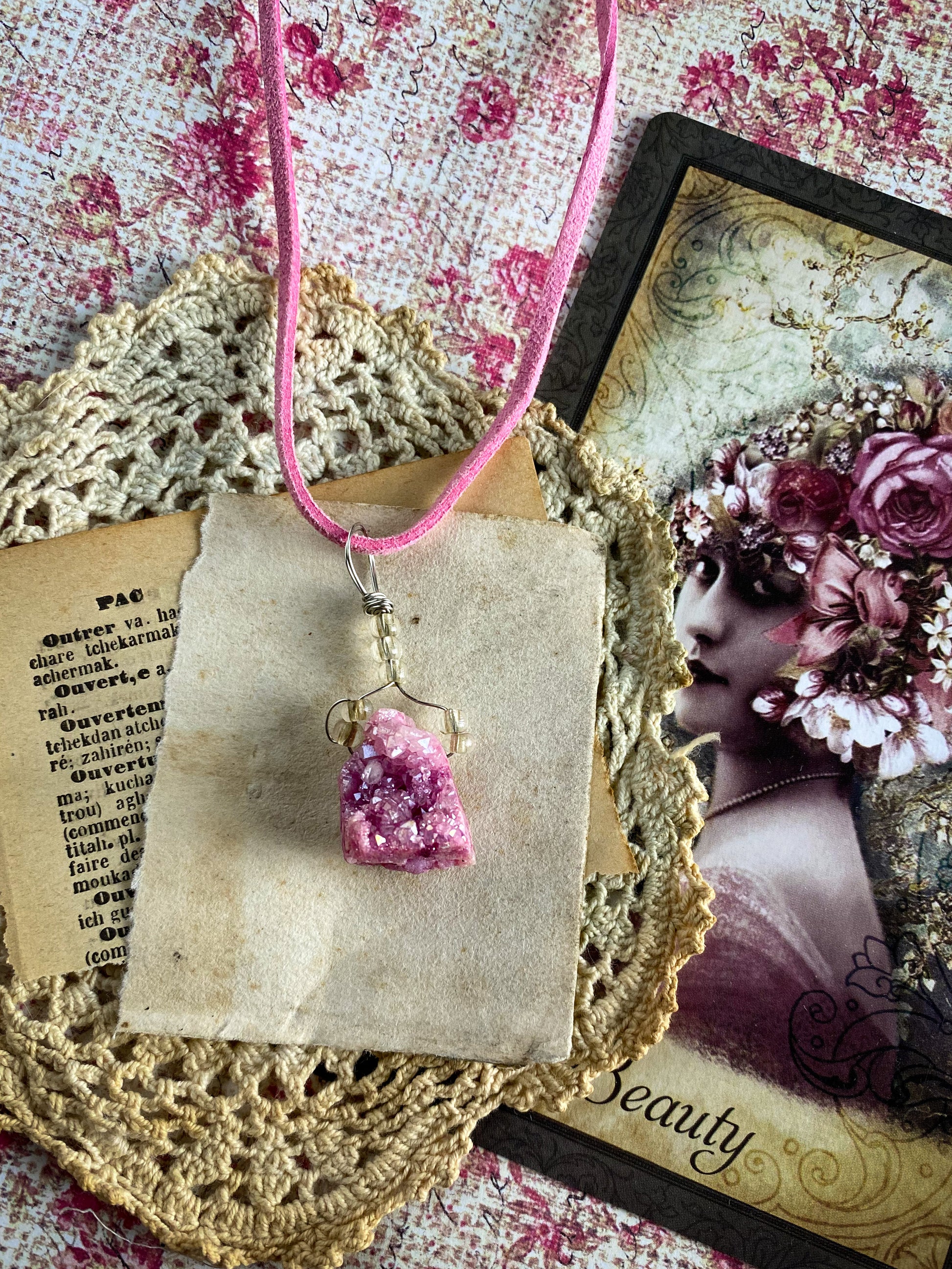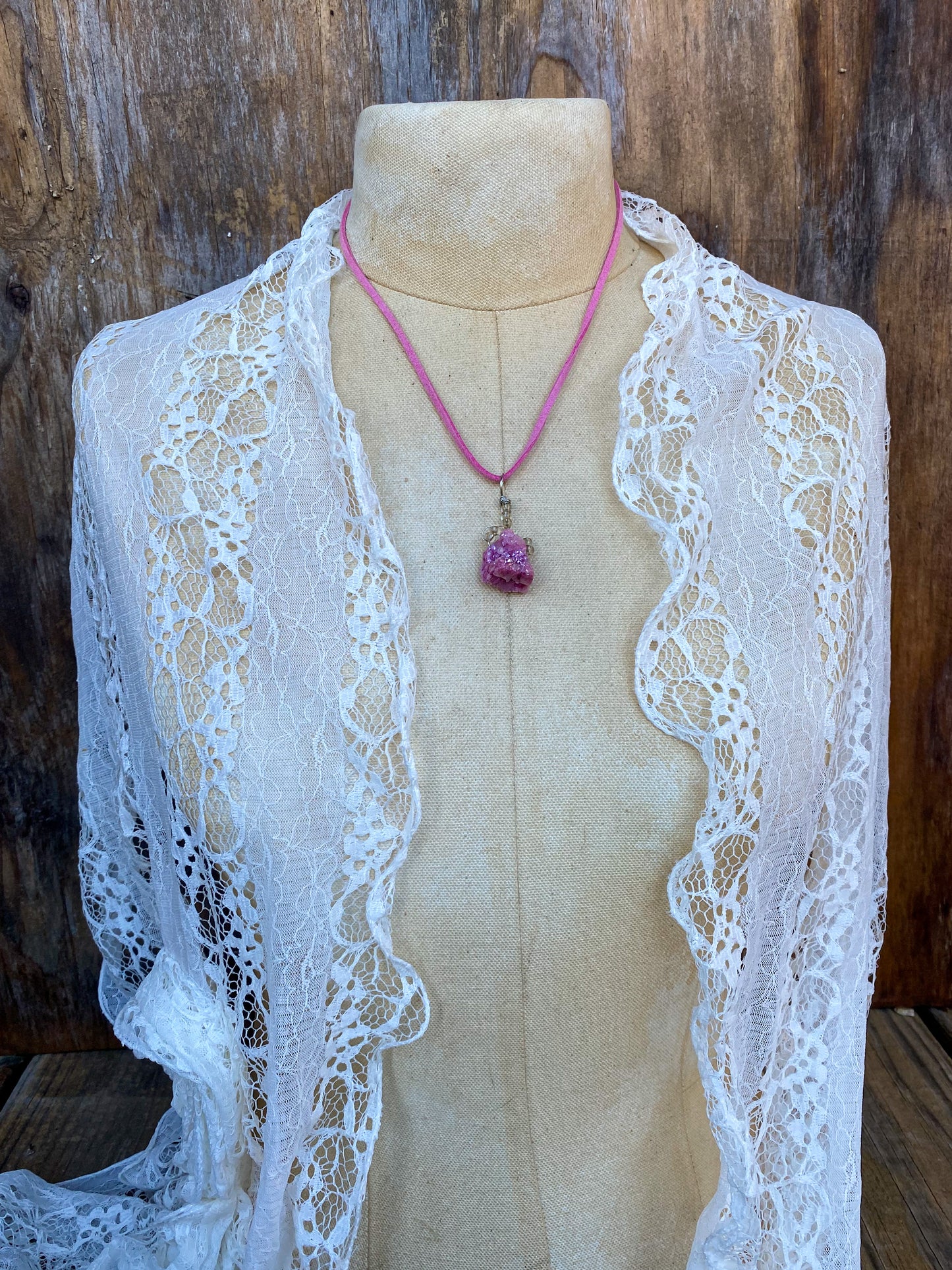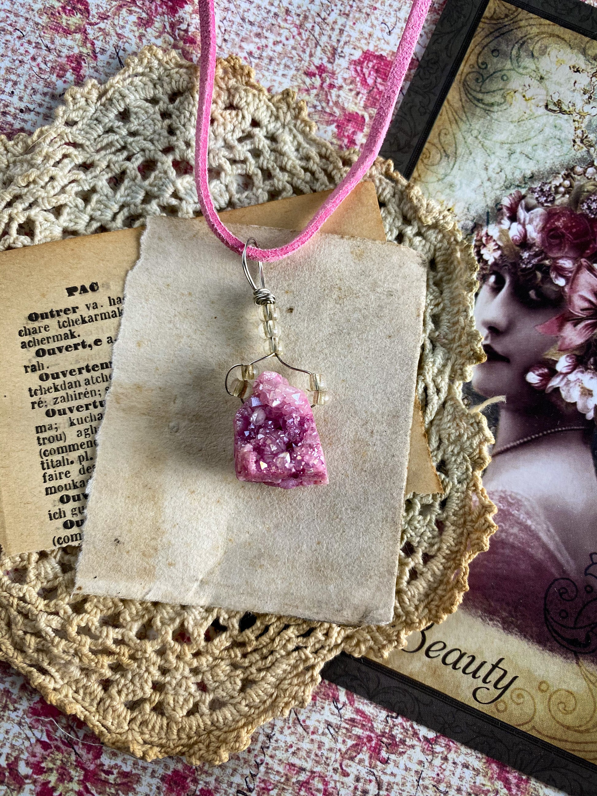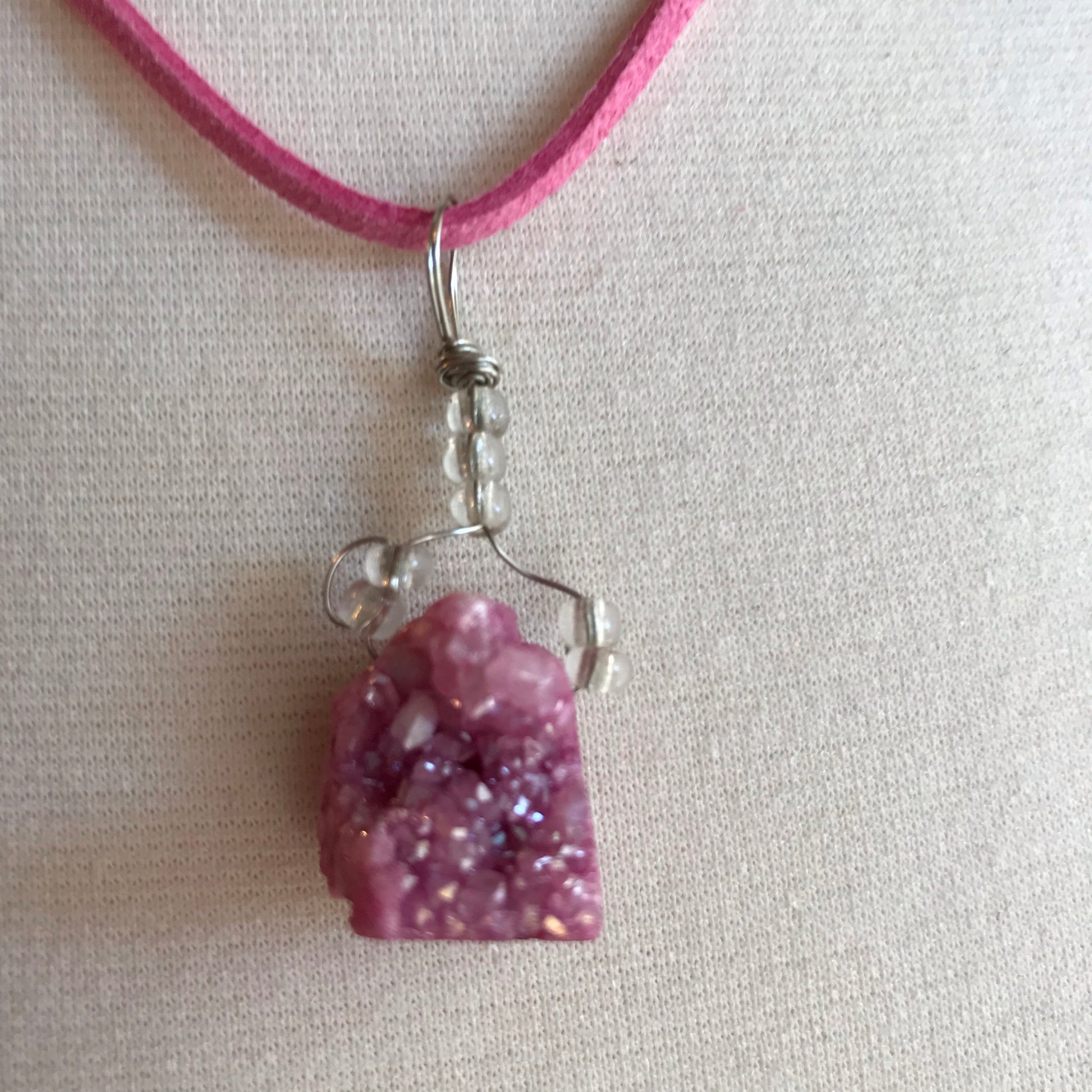 This Druzy crystal necklace was assembled by hand in my studio. It comes on an 18 inch vegan suede cord.