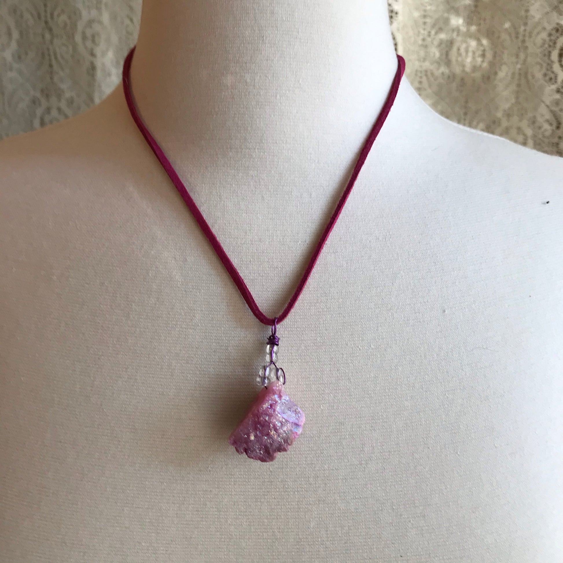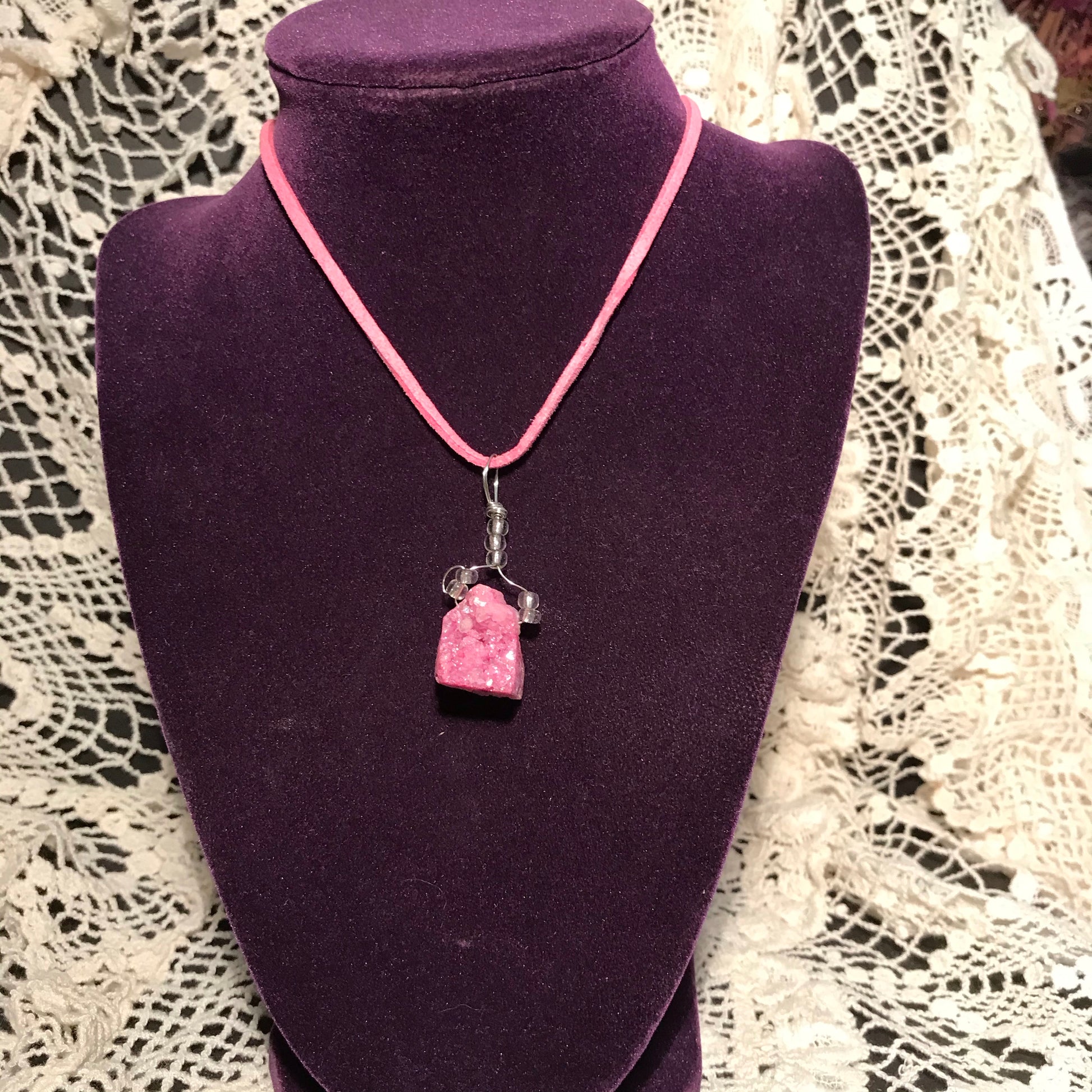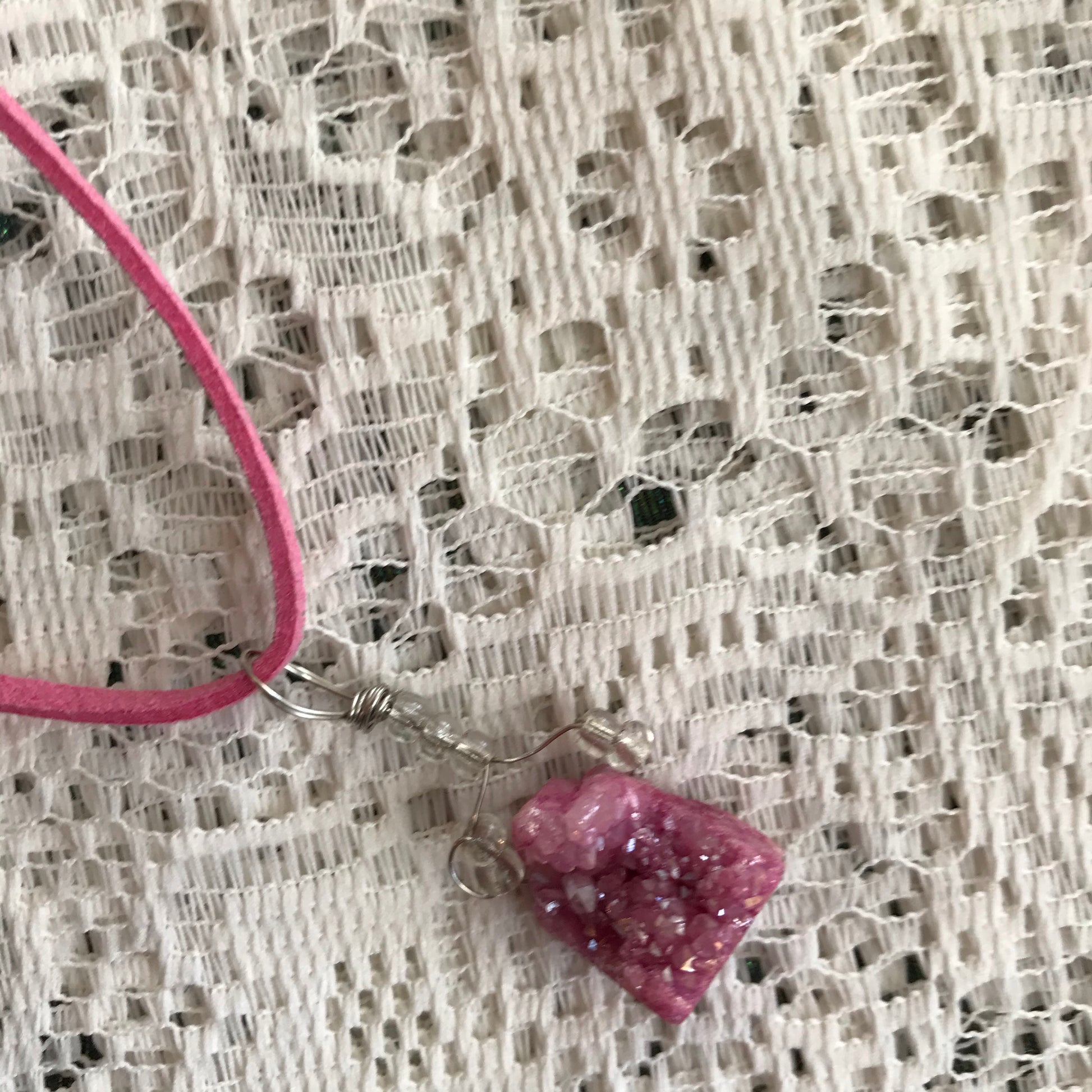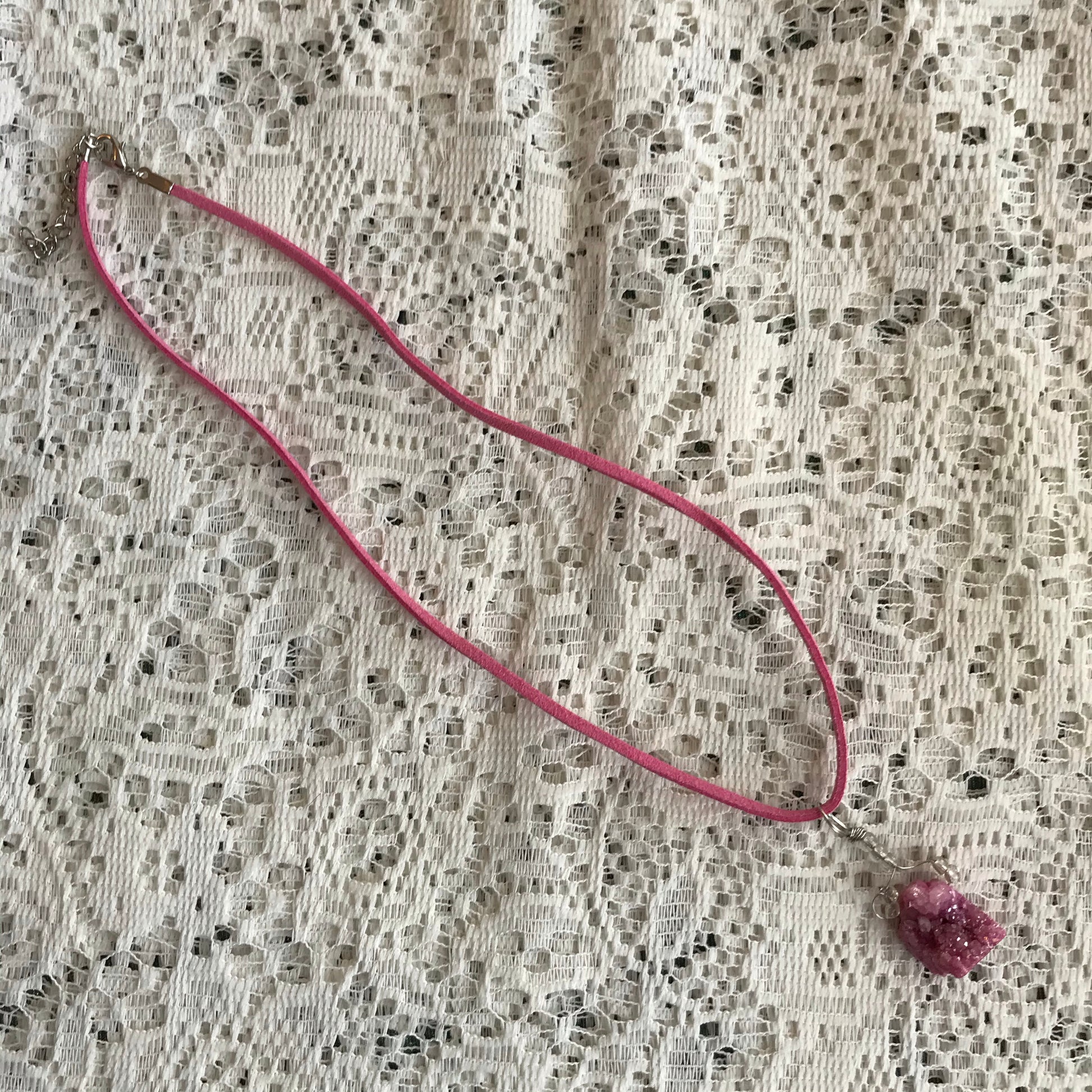 This Druzy crystal necklace was assembled by hand in my studio. It comes on an 18 inch vegan suede cord.