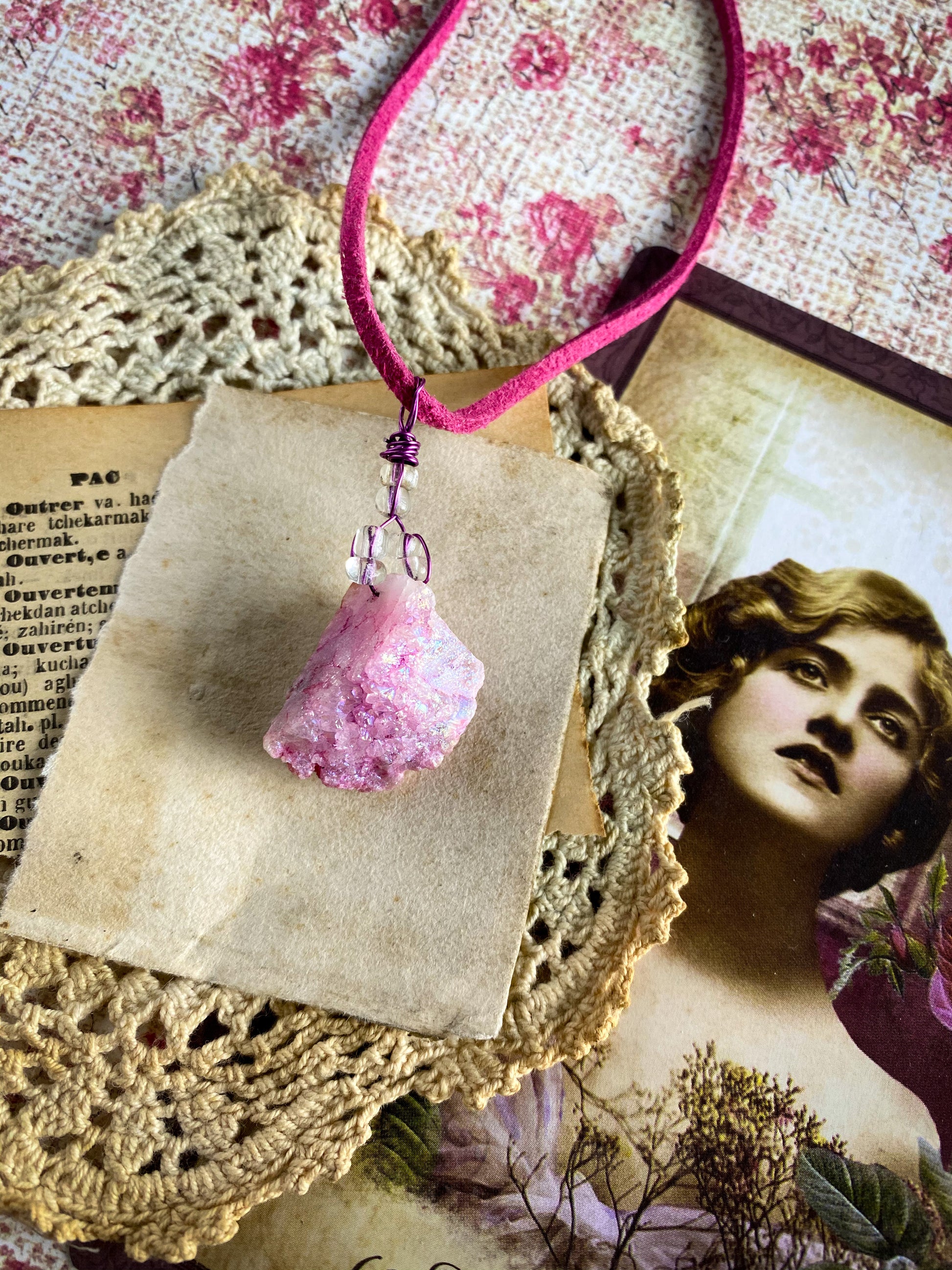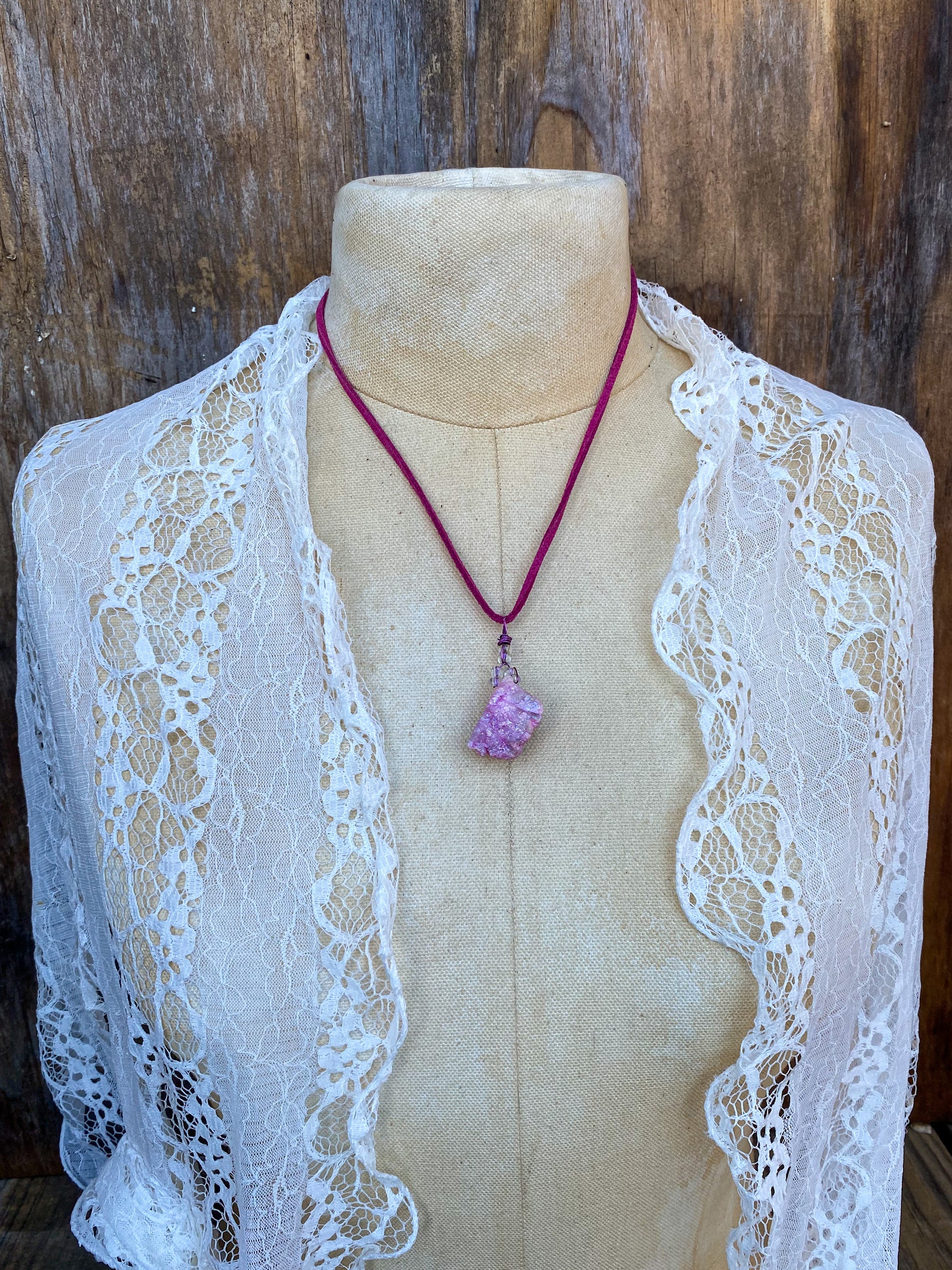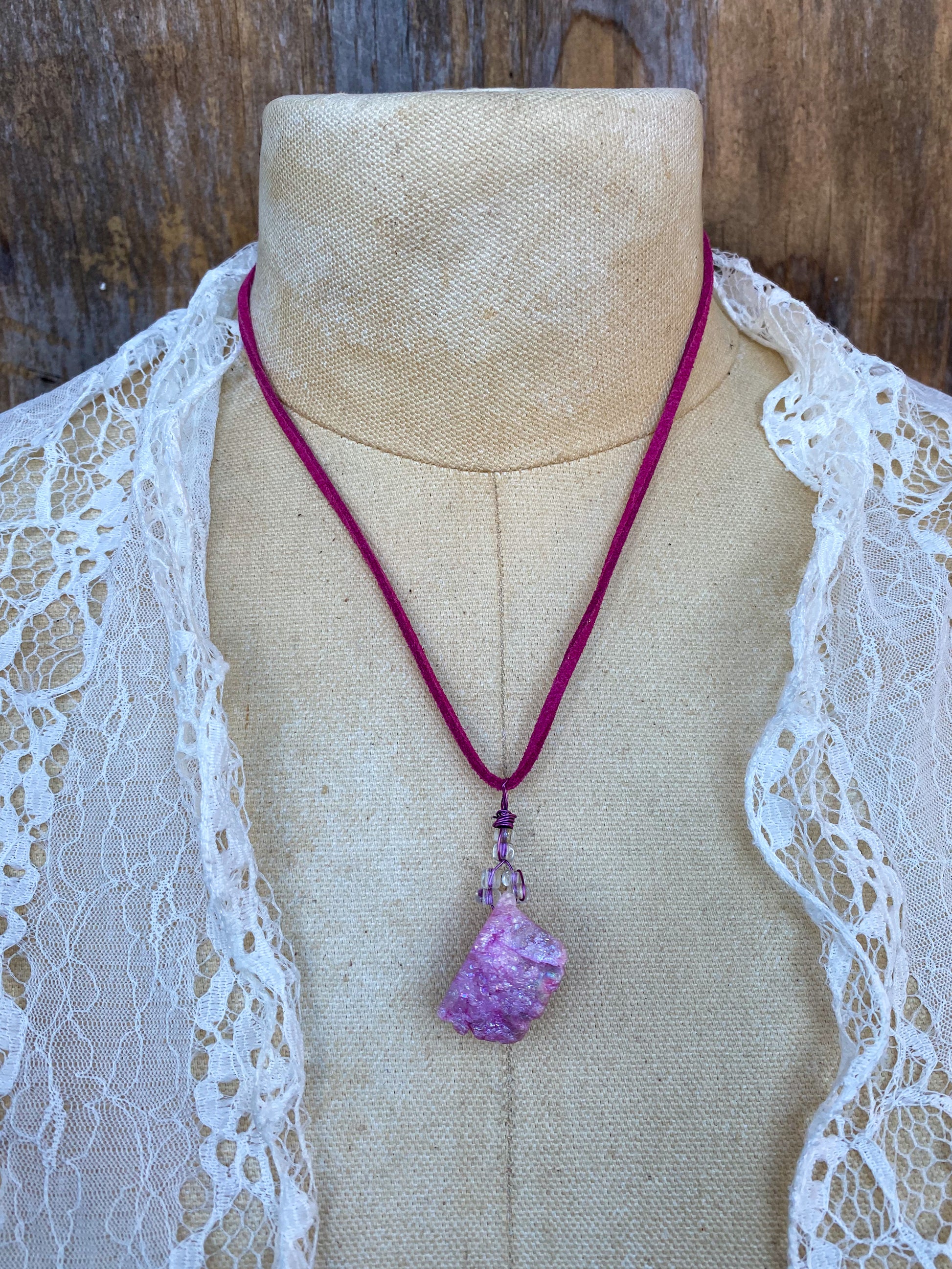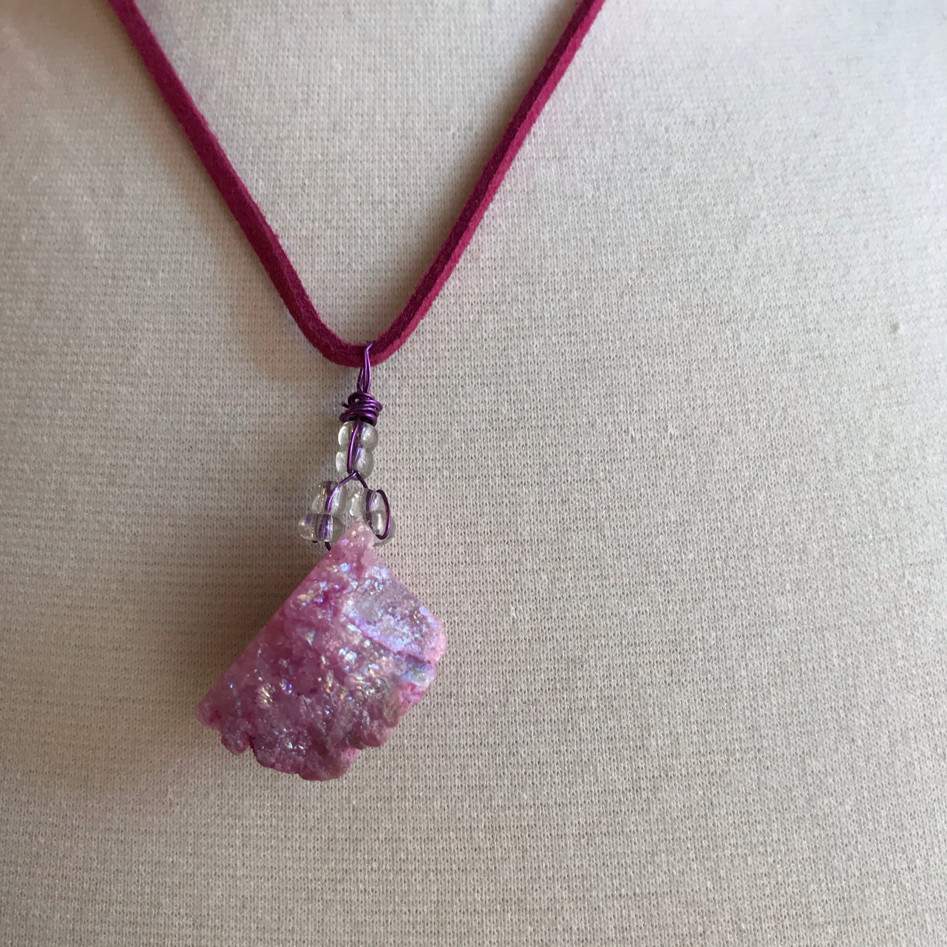 This Druzy crystal necklace was assembled by hand in my studio. It comes on an 18 inch vegan suede cord.