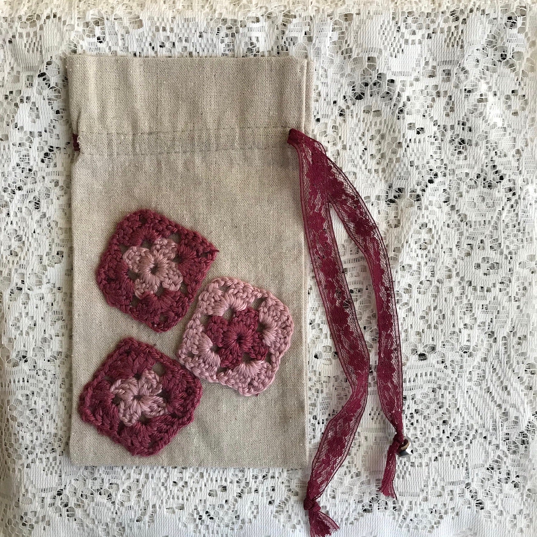 Canvas drawstring bag with pretty crochet diamonds and a lacy tie.