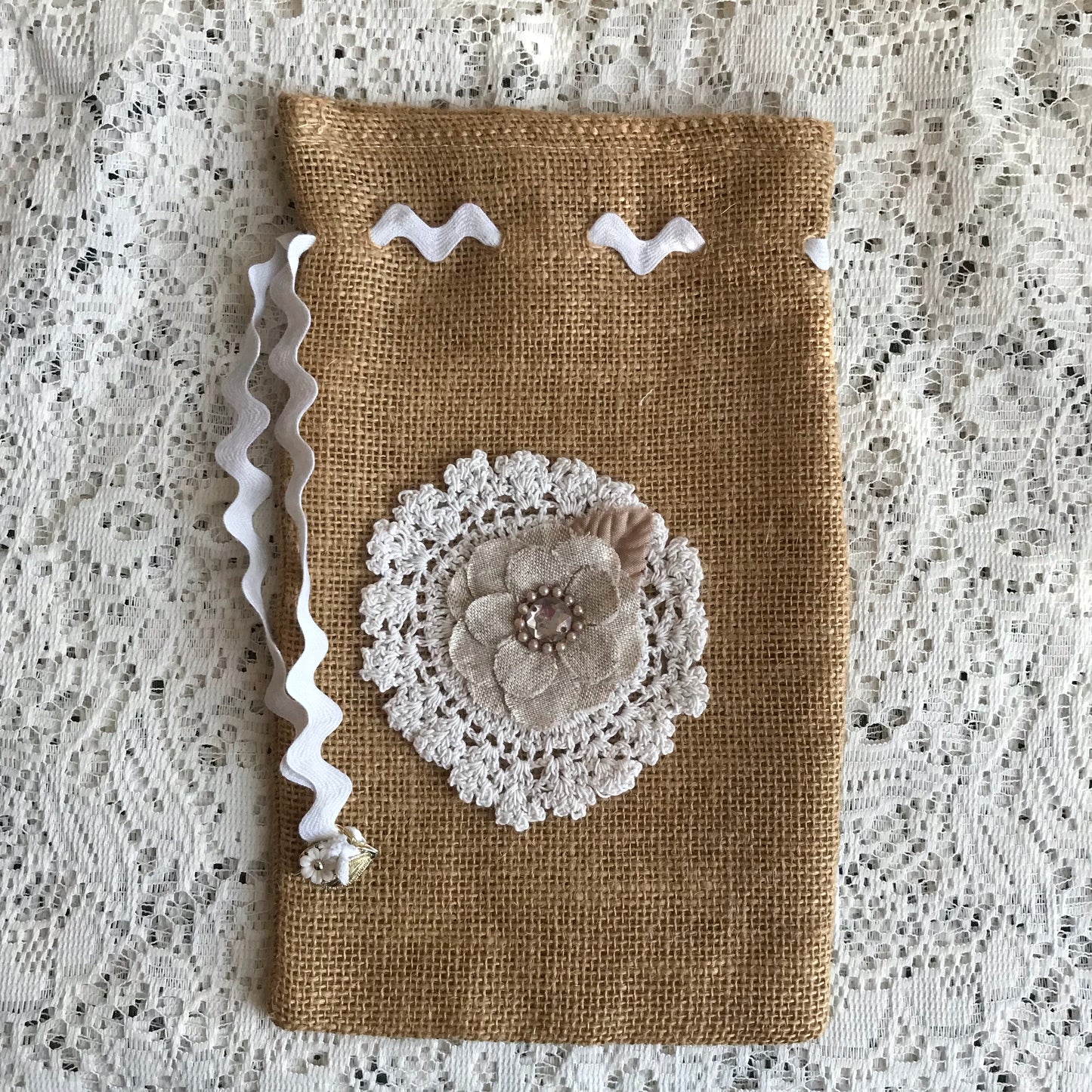 Burlap drawstring bag with crochet doily and pretty flower charm.