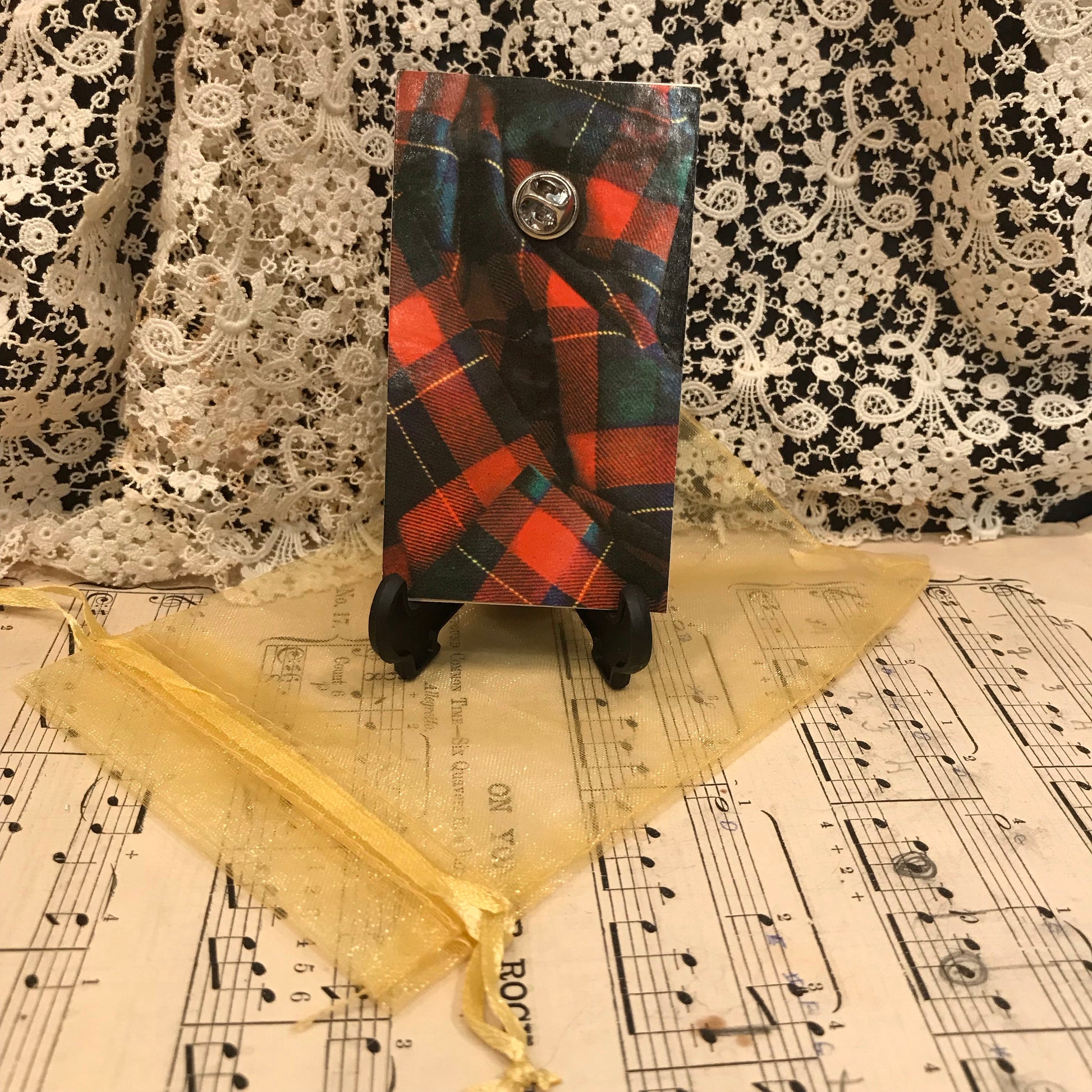 The backing is a piece of a vintage vinyl record album cover.