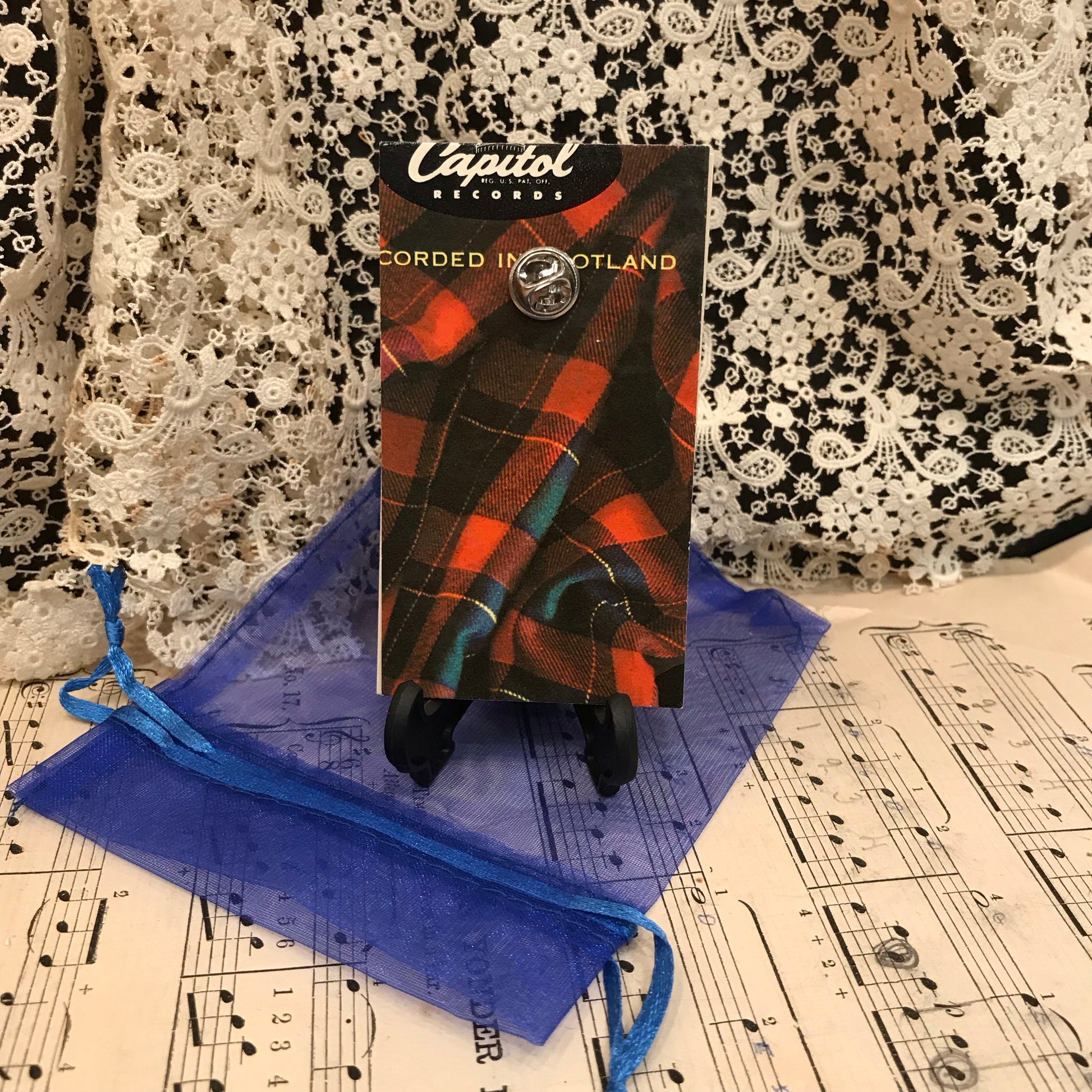 The backing is a piece of a vintage vinyl record album cover.