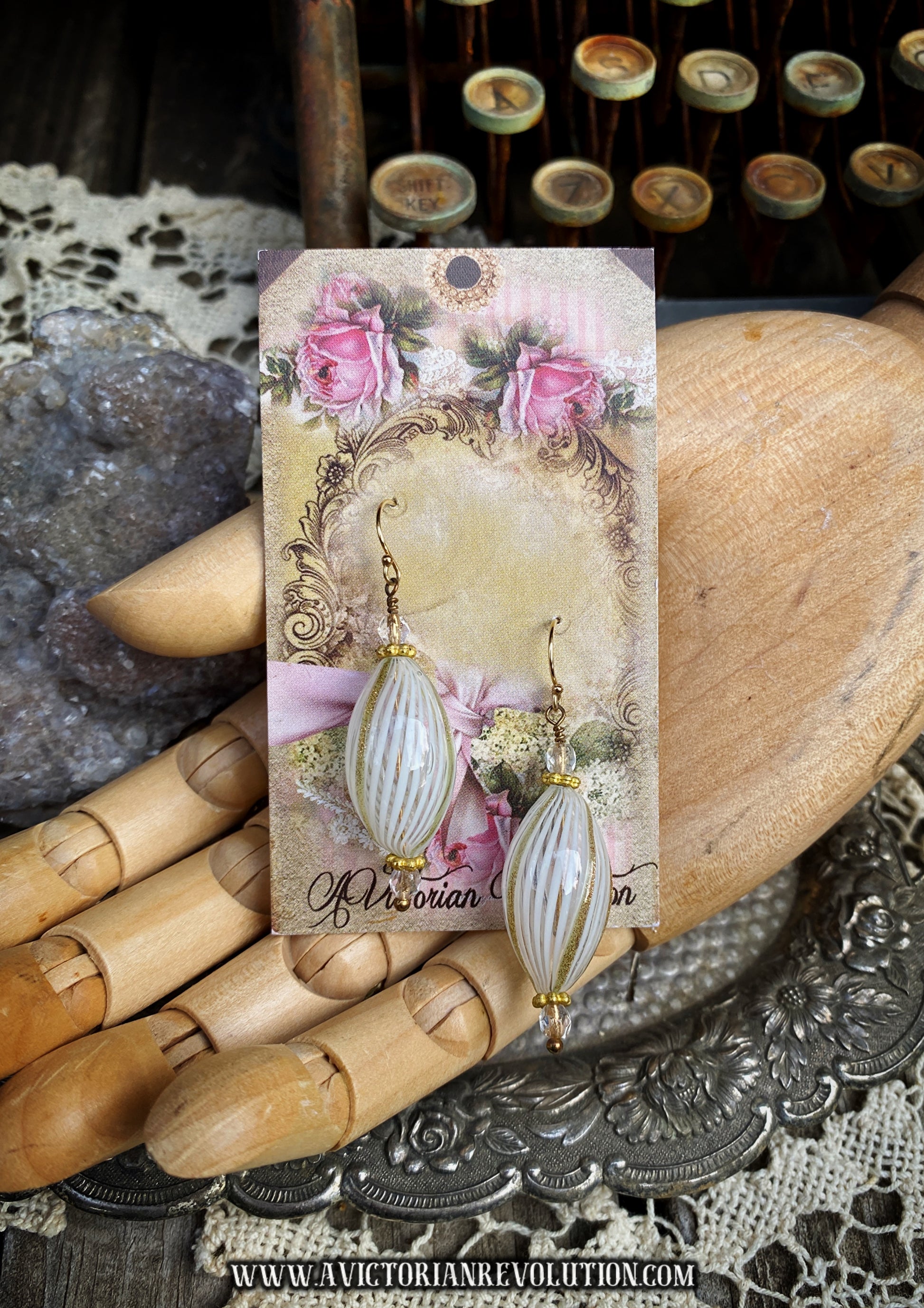These hand blown glass earrings feature a teardrop shape with a creamy white base and raised gold metallic ribbing. The glass work has a slight swirl to it that feels very intentional and substantial without being heavy. They are finished with small clear beads and gold tone hardware for a clean, classic look.